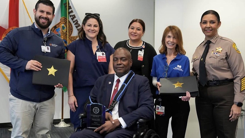 Fellow Canine Unit Officer Isabel McDonald, who is in the same unit as Officer Sangineto, also visited him every day, and even though he was in a coma, she would sit and talk to him. Over the beeps and hum of the machines that monitored and supported his body, she told him that “prayer chains” had formed and that hundreds of people were praying for him every day, not just in Miami-Dade County, but throughout the state, the country and even internationally. She told him about his son, how he was collecting law enforcement challenge coins from across the county, with the assistance of the Miami-Dade Police Department. She would tell him about what was going on at work, as if she had pulled up her police vehicle next to his to chat, as they customarily did at the Seaport. She kept assuring him that he would pull through, even though she had been told by the medical staff that his condition was grave, and that recovery was against the odds.
